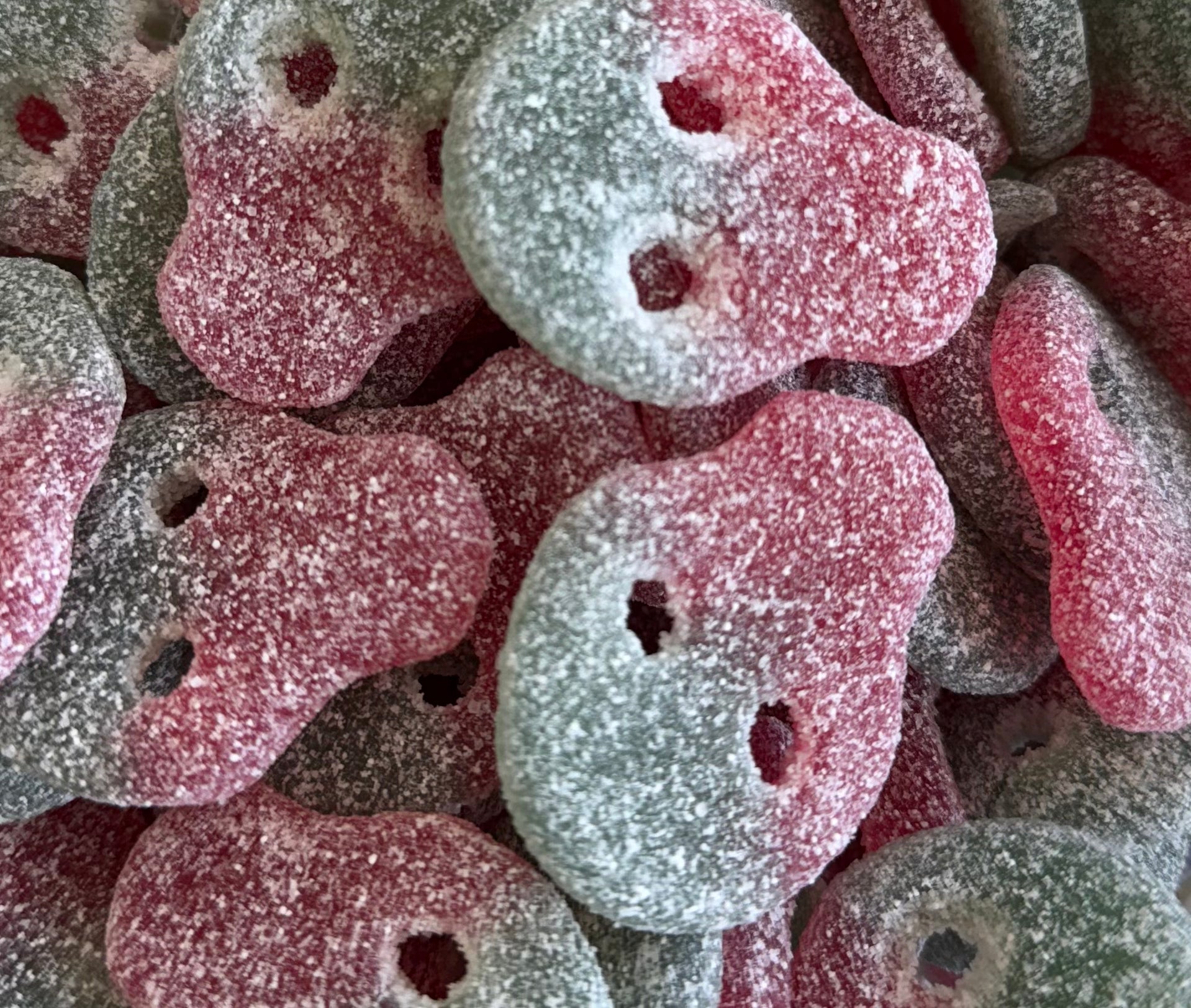 Saure Wassermelonen-Schädel - Schwedische / Niederländische Süßigkeiten. Diese kräftig grünen und roten, schädelgeformten Gummis haben eine saure Zuckerbeschichtung mit Wassermelonengeschmack und werden mit vegan-freundlichen Zutaten hergestellt. Diese gelatinefreien Leckereien sind ein beliebter schwedischer Klassiker und perfekt, um jeder Süßigkeitenmischung Farbe, Textur und eine spielerische Note zu verleihen.