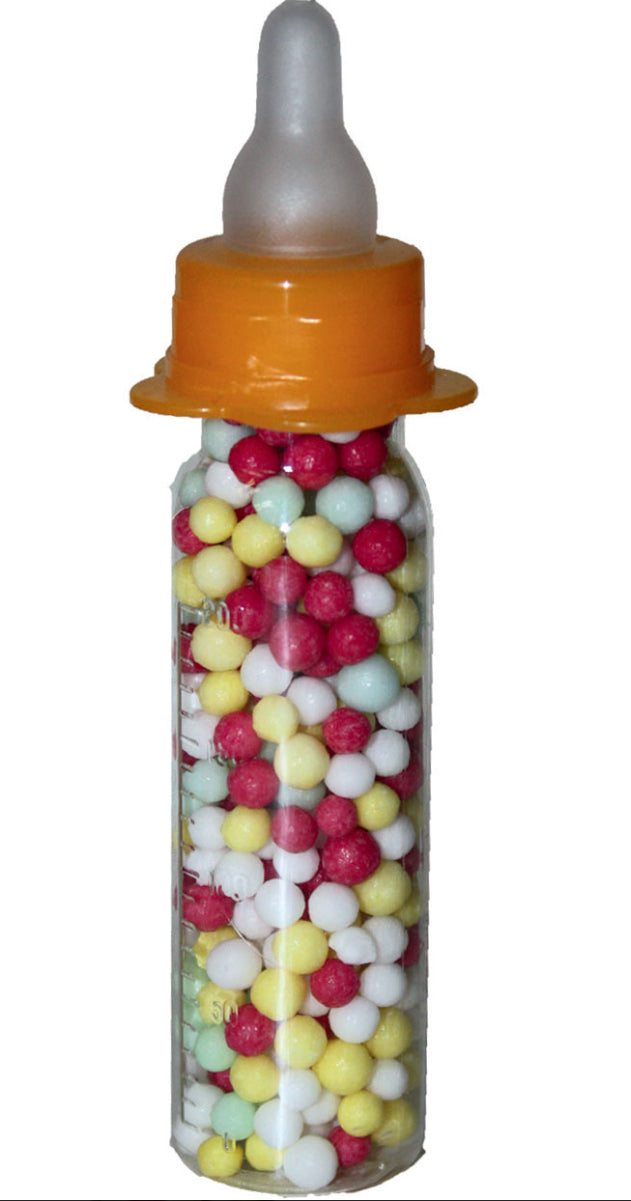 Babyfläschchen mit Liebesperlen (Zucker-Dragées) in unterschiedlichen Geschmacksrichtungen. Mit natürlichen Aromen und Farbstoffen.